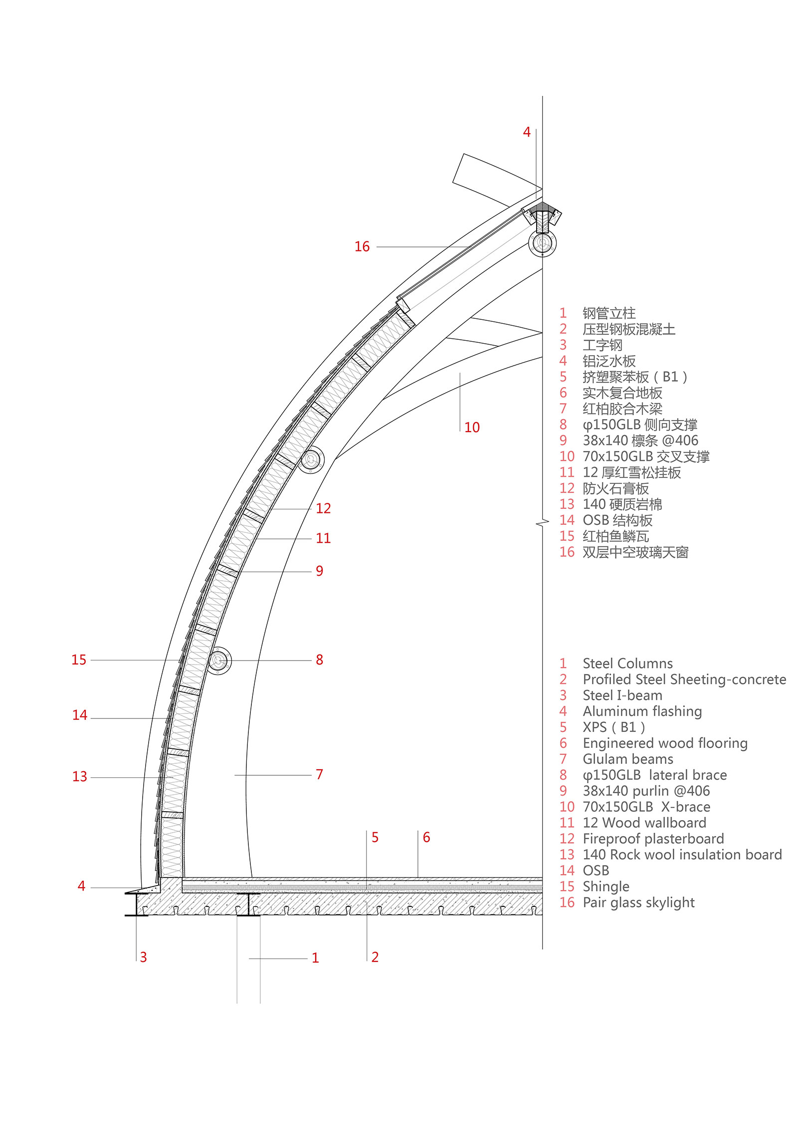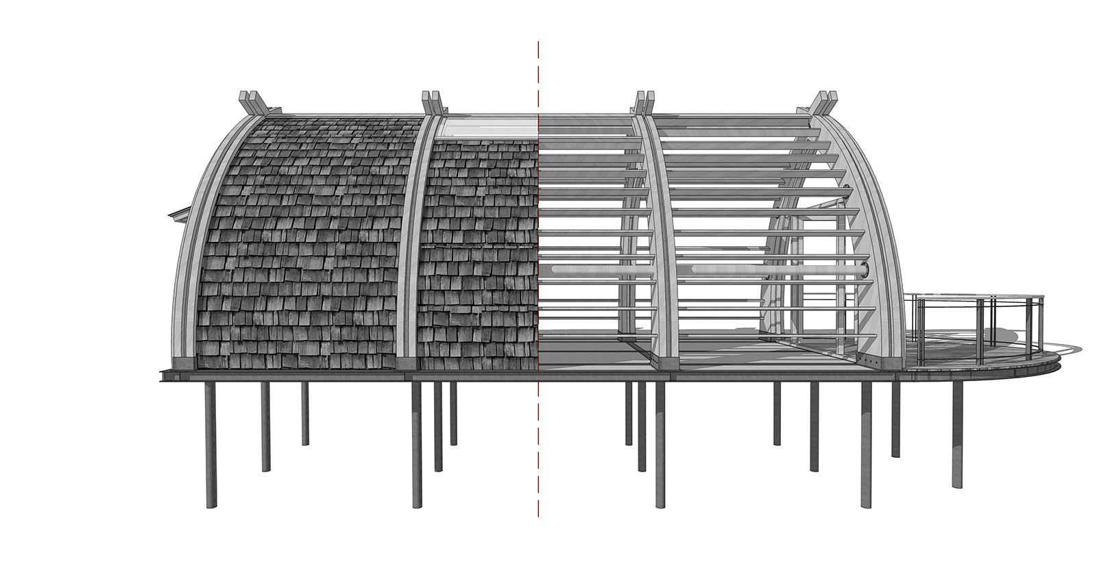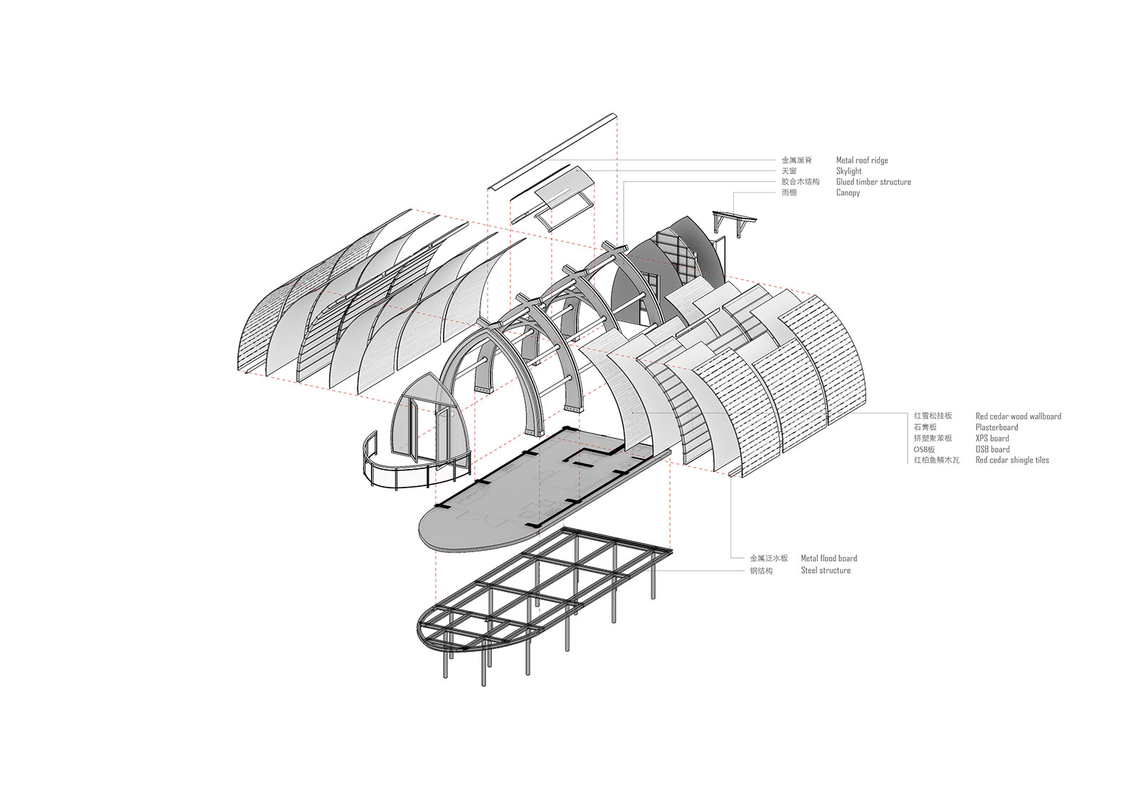 船尾細(xì)節(jié) 拱形的船身結(jié)構(gòu),由四組三鉸拱木拱梁通過五根圓木連接為整體,每組三鉸拱由左右兩個對稱半拱吊裝拼接,而每個半拱又由兩道十一公分寬的北美花旗松膠合拱梁組合成,拱頂?shù)男〗徊嬲鎸嵎磻?yīng)拱結(jié)構(gòu)的對接特征。采用三鉸拱的形式,避免了木材因過度彎曲而產(chǎn)生超限的應(yīng)力。整個屋面系統(tǒng)保持在拱梁的厚度之中,內(nèi)部紅雪松掛板使用水性清漆保持原木紋理和觸感,外部使用了三種尺寸的紅雪松木瓦上下微錯的鋪裝方式,質(zhì)感自然。