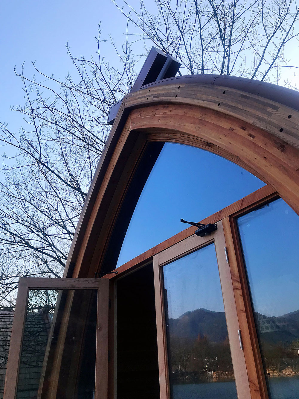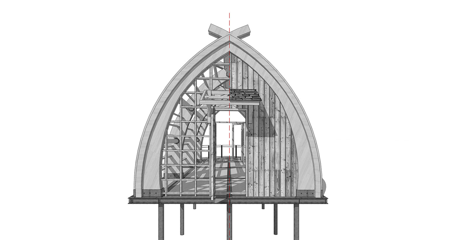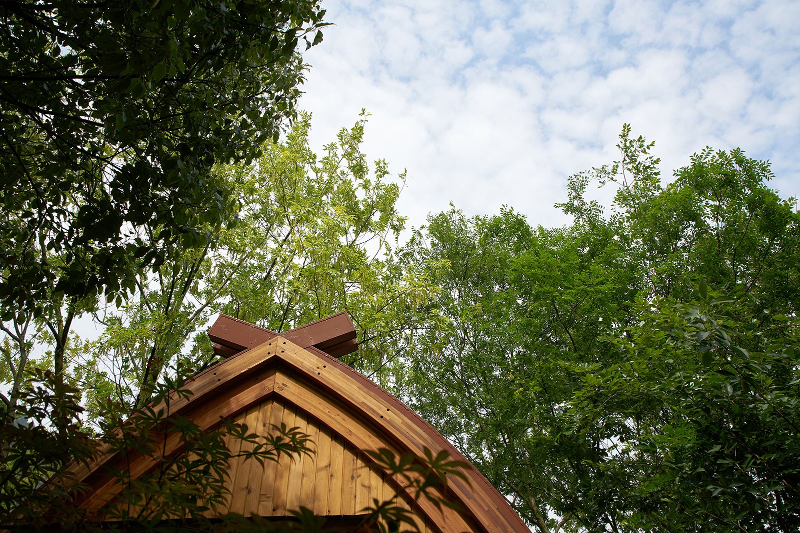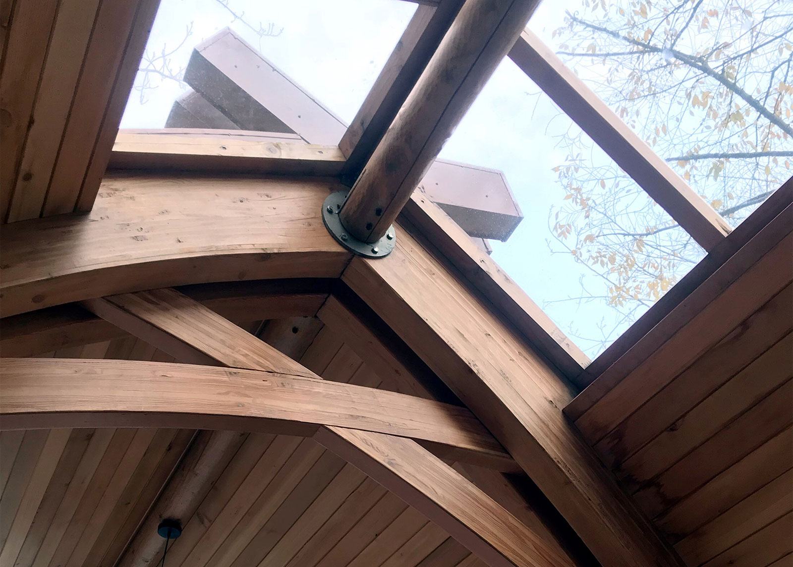 船尾細(xì)節(jié) 拱形的船身結(jié)構(gòu),由四組三鉸拱木拱梁通過五根圓木連接為整體,每組三鉸拱由左右兩個對稱半拱吊裝拼接,而每個半拱又由兩道十一公分寬的北美花旗松膠合拱梁組合成,拱頂?shù)男〗徊嬲鎸嵎磻?yīng)拱結(jié)構(gòu)的對接特征。采用三鉸拱的形式,避免了木材因過度彎曲而產(chǎn)生超限的應(yīng)力。整個屋面系統(tǒng)保持在拱梁的厚度之中,內(nèi)部紅雪松掛板使用水性清漆保持原木紋理和觸感,外部使用了三種尺寸的紅雪松木瓦上下微錯的鋪裝方式,質(zhì)感自然。