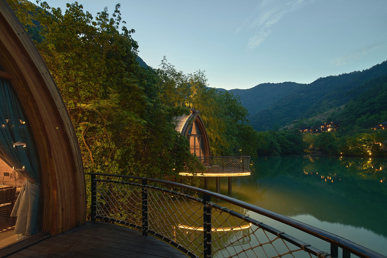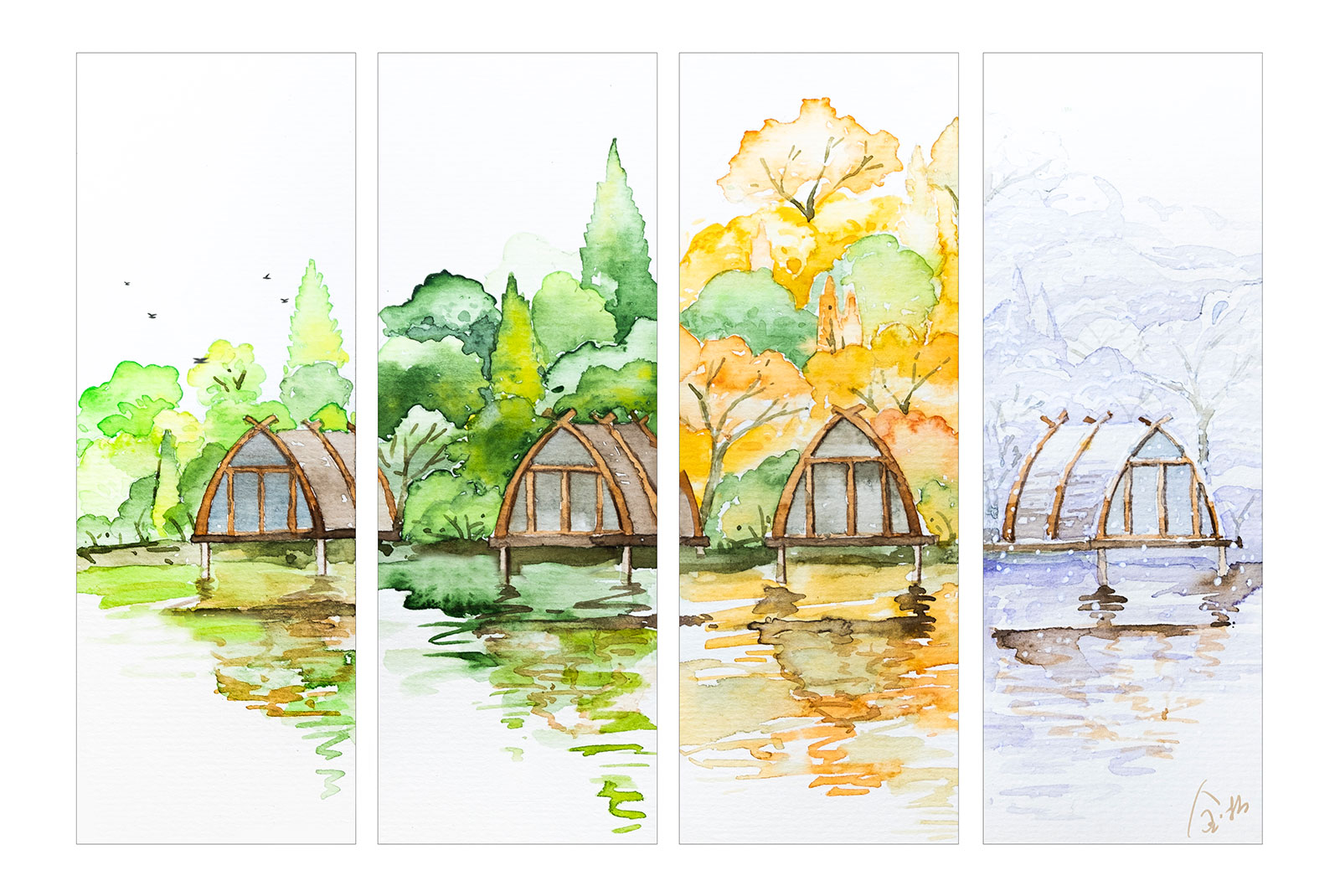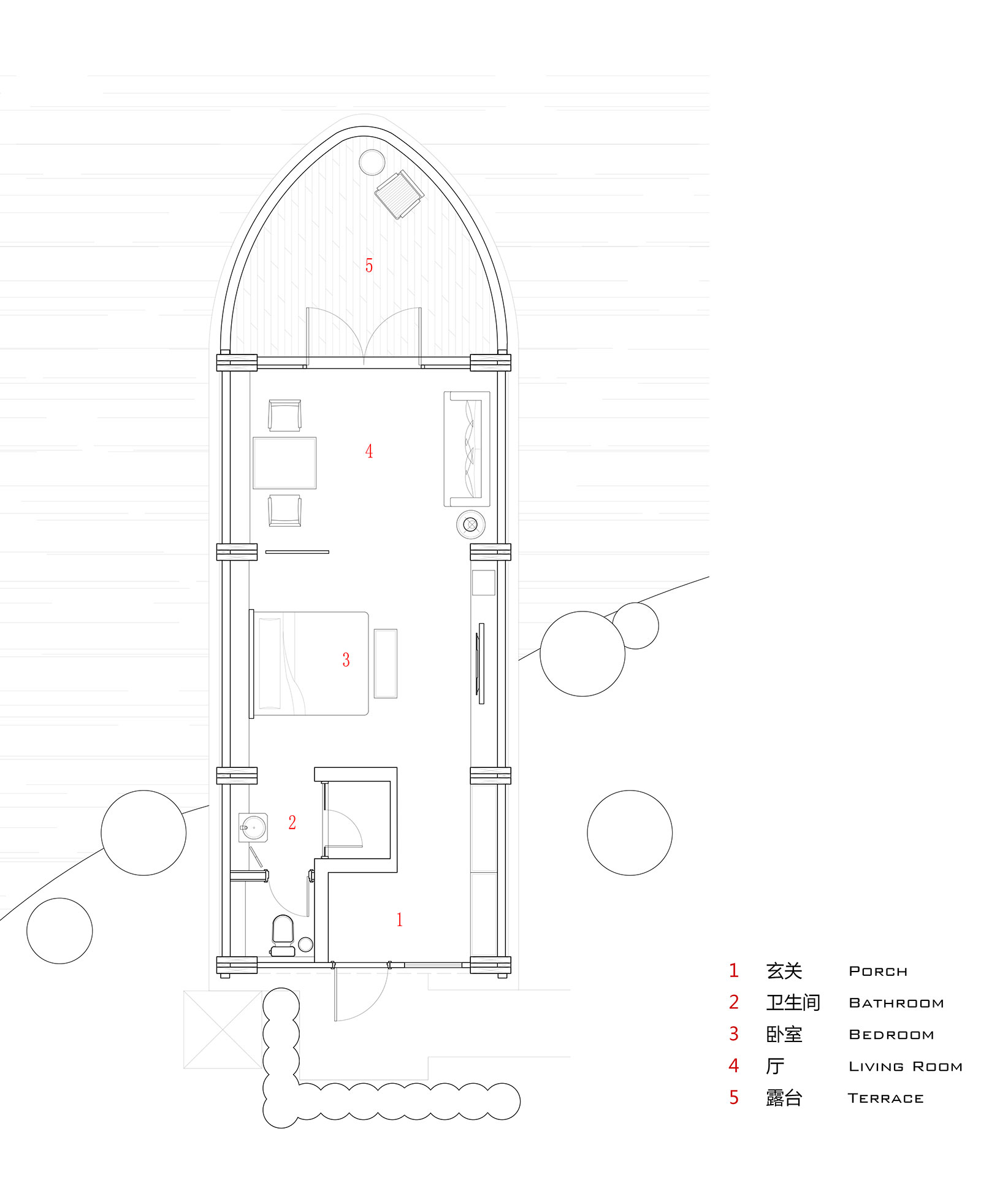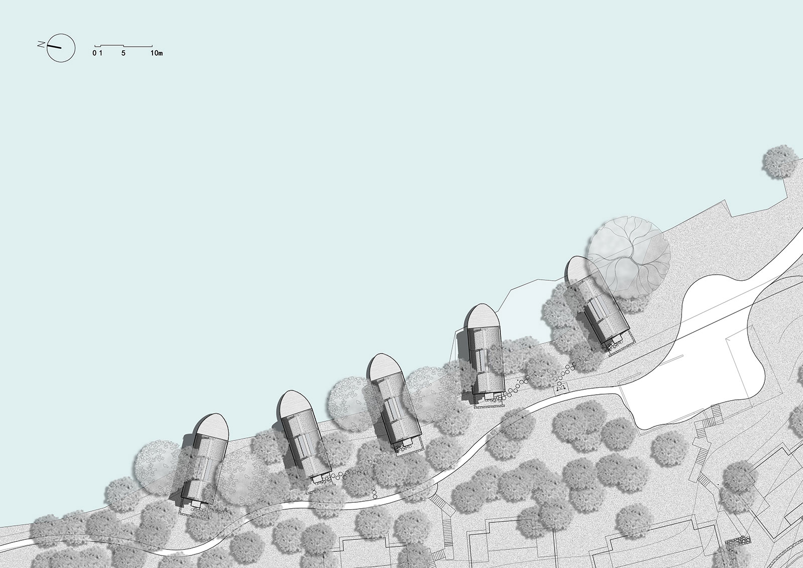 船屋水彩,金拓繪制 “船屋”的概念和形態(tài),源自當(dāng)?shù)氐墓爬巷L(fēng)俗。明初至清中幾百年間生活在這里的水上部落--“九姓漁民”,形成獨有的船居文化。五艘船屋橫斜在樹冠之間,船身三分之二飄在湖面上,輕盈靈動。作為酒店客房,船屋也成為當(dāng)下一種獨特的居住體驗,在50平方米的空間內(nèi),岸上的船尾作為入口玄關(guān)和衛(wèi)生間。中間頂部設(shè)置天窗成為室內(nèi)的景框,天光樹影共徘徊,時而有飛鳥掠過。船頭整面落地窗,即使坐在沙發(fā)上亦可感受煙波浩瀚,站上延伸至湖面的超大露臺靠著麻繩網(wǎng)欄桿,憑欄遠(yuǎn)眺,野曠天低樹,夜幕降臨,江清月近人。