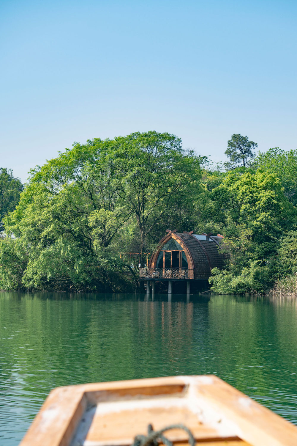 從小船上看船屋 江南之美,甲于天下。烏龍山泉匯聚而成煙渚湖,湖面如鏡倒映船拱,比天空還要寧靜,躺在船屋中,望著星空入睡,是何等之美,和著雨聲入眠,又是何等之空靈!春水碧于天,畫船聽雨眠,是塵世中的詩意棲居。