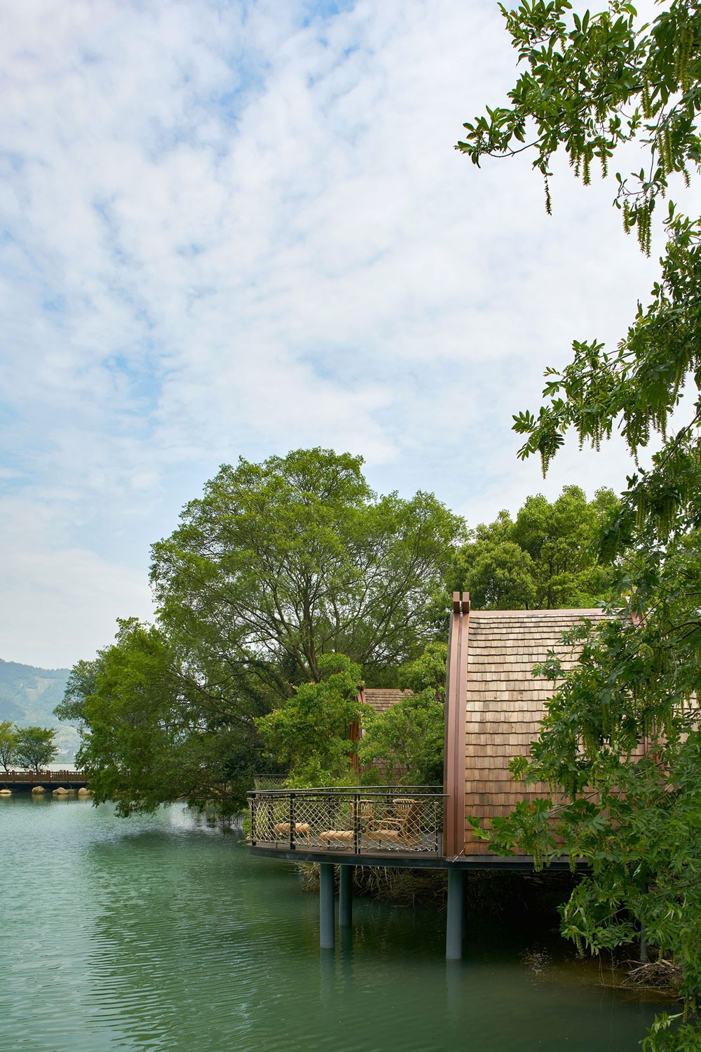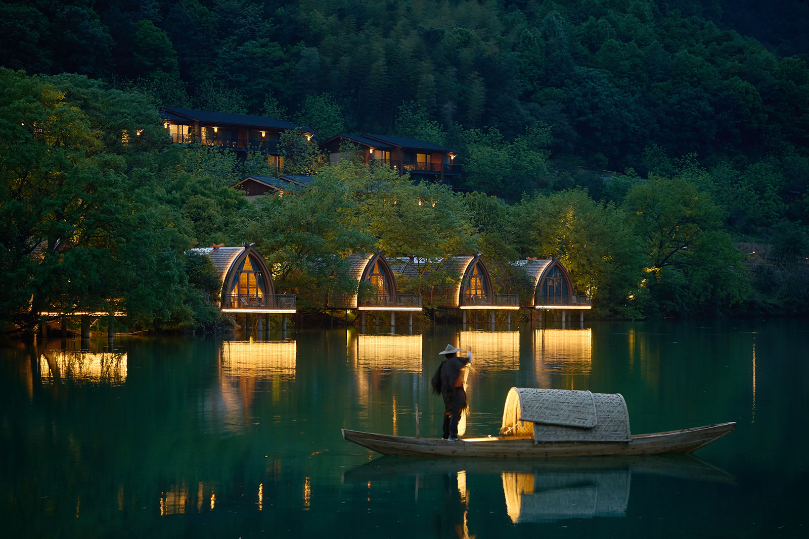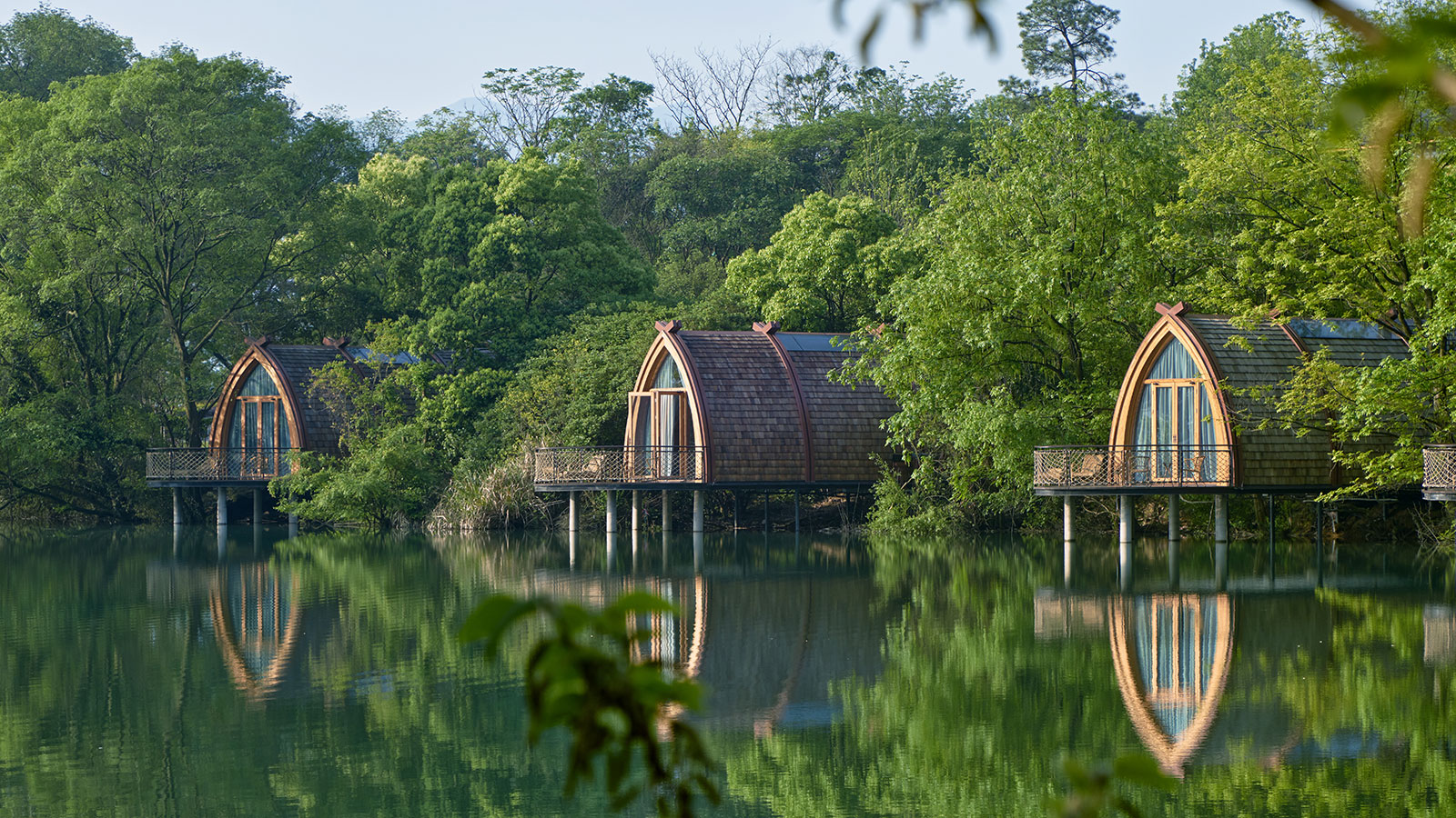 本項目是杭州富春開元芳草地鄉(xiāng)村酒店的一組特色船屋客房。酒店坐落在建德富春江畔,梅城古鎮(zhèn)東約五公里處,而船屋則“漂浮”在酒店30畝湖面西岸。