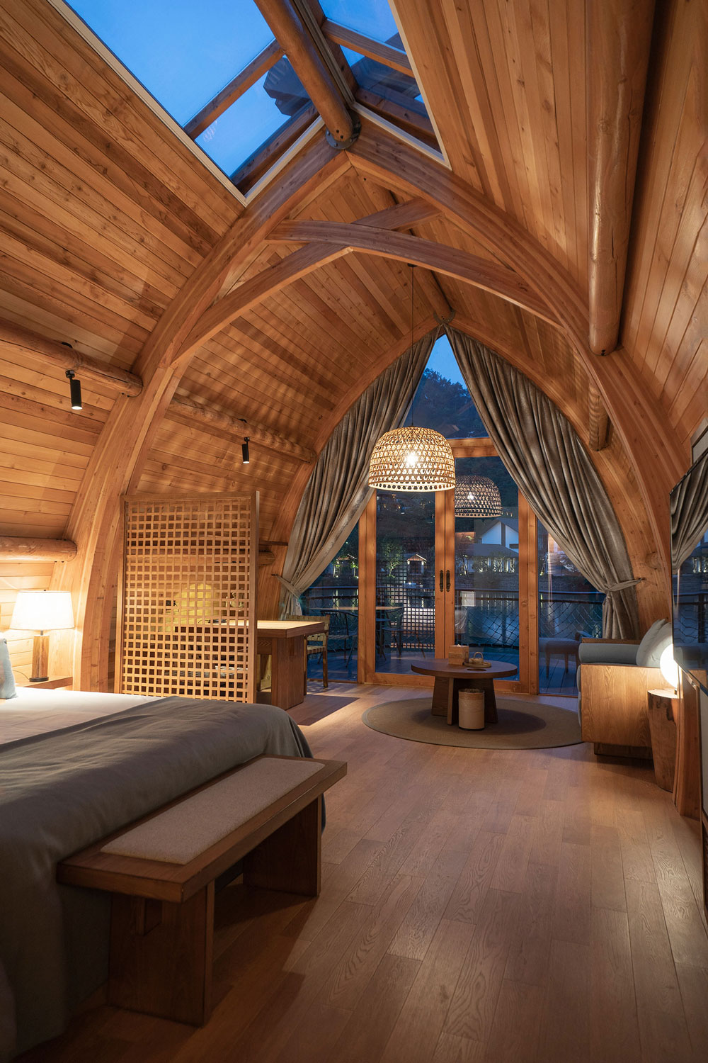 室內(nèi) 拱空間天生的方向性,引導(dǎo)了結(jié)構(gòu)的序列和節(jié)奏,建筑內(nèi)外清晰可見拱梁和圓木構(gòu)成的完整結(jié)構(gòu)體系。顯而易見的結(jié)構(gòu)邏輯和去裝飾化設(shè)計,展現(xiàn)建筑的結(jié)構(gòu)美學(xué)和空間張力。