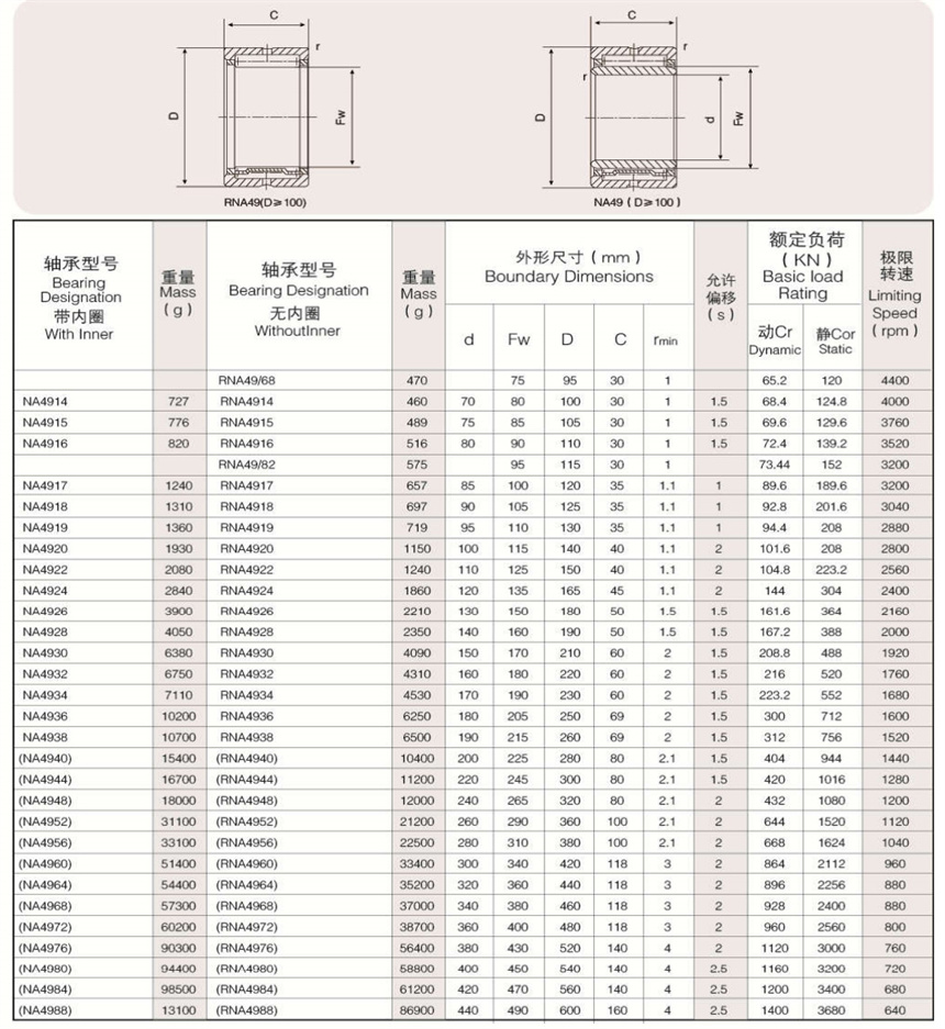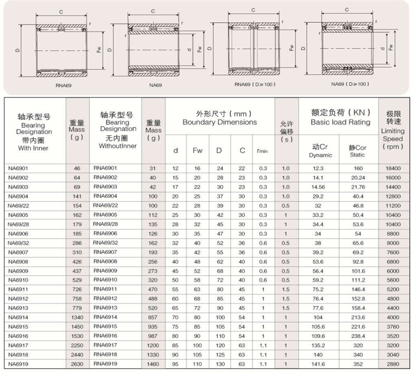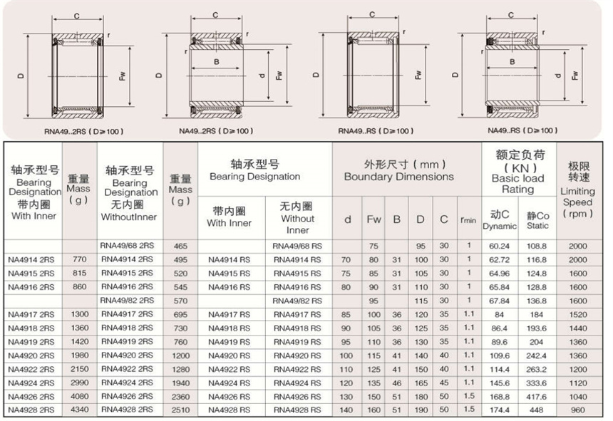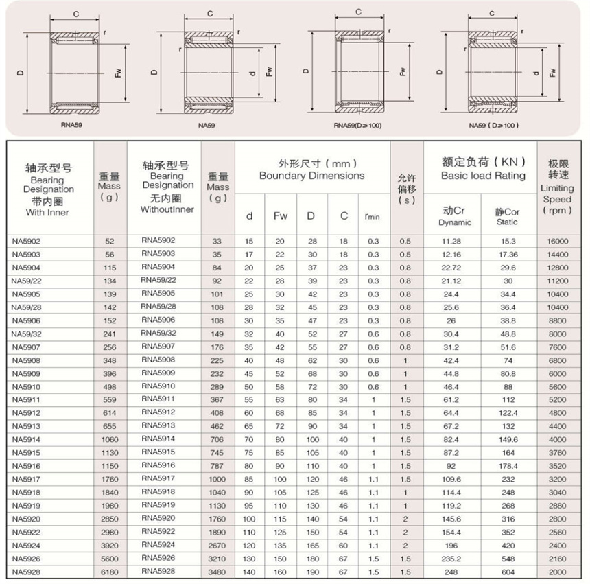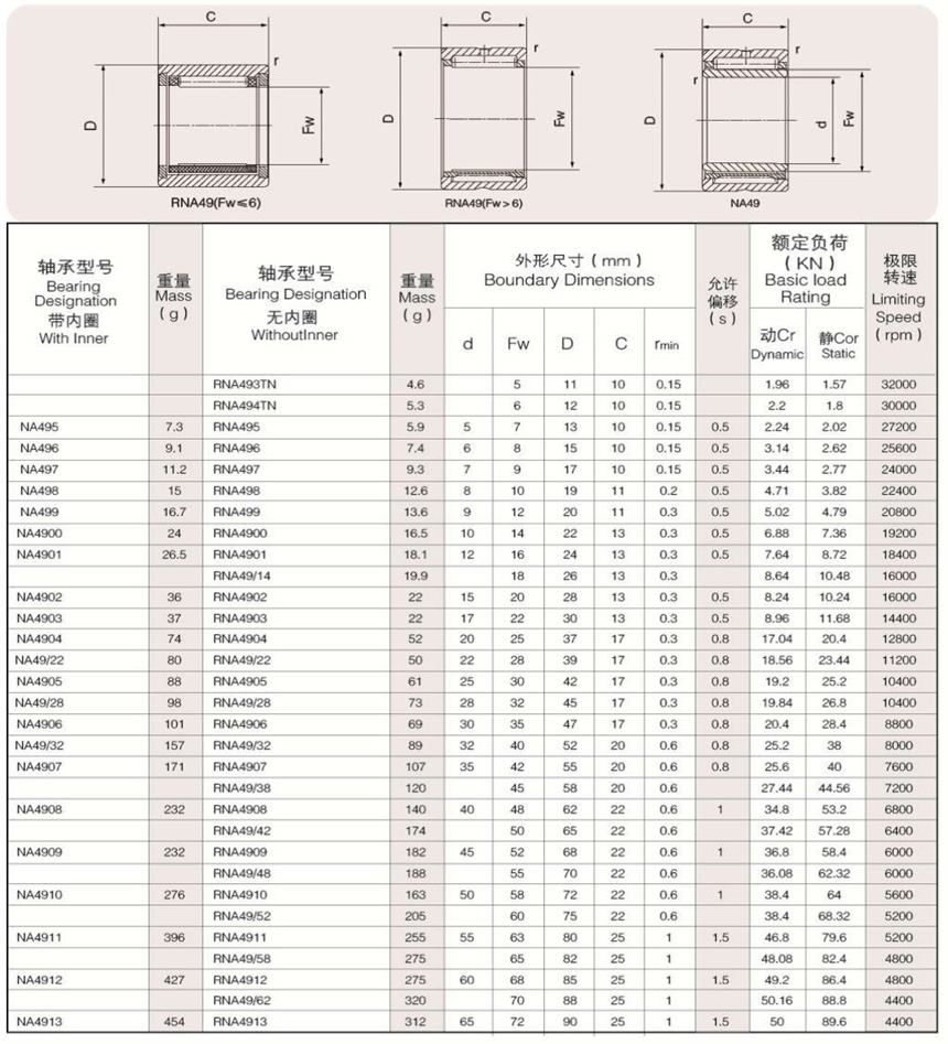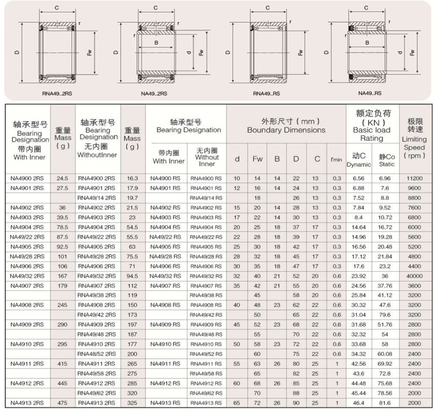 此類軸承有多種結(jié)構(gòu)及尺寸系列,要求軸頸或外殼滾動表面硬度,加工精度和表面粗糙度應(yīng)與軸承套圈相 同。所組裝G2級滾針,分組批直徑變動量在2 um之內(nèi),除滿裝滾針軸承外,均采用高剛性保持架,能夠正確 地引導(dǎo)滾針平行軸線。