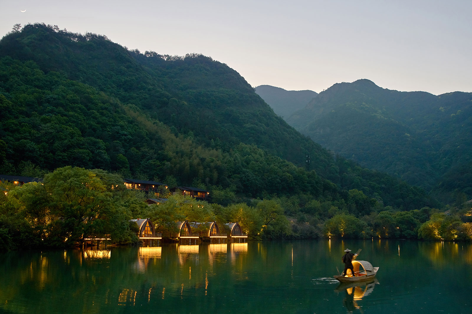 本項(xiàng)目是杭州富春開元芳草地鄉(xiāng)村酒店的一組特色船屋客房。酒店坐落在建德富春江畔,梅城古鎮(zhèn)東約五公里處,而船屋則“漂浮”在酒店30畝湖面西岸。
